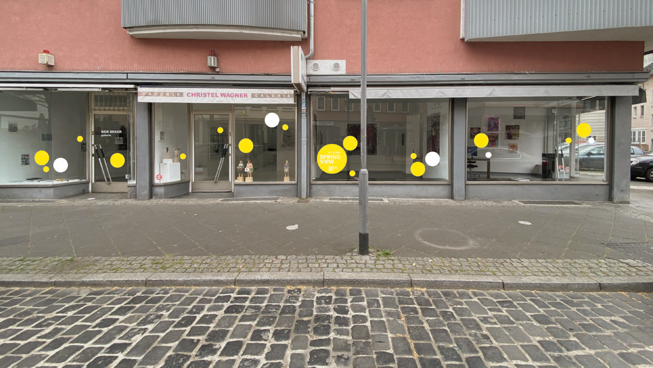 Placed in the Gallery windows along Fahrgasse, a connected sequence of yellow and white dots guides visitors through this year's Spring View. Established as a highlight during Frankfurt's art calender, Spring View connects gallery and urban space, offering a special kind of urban art experience.