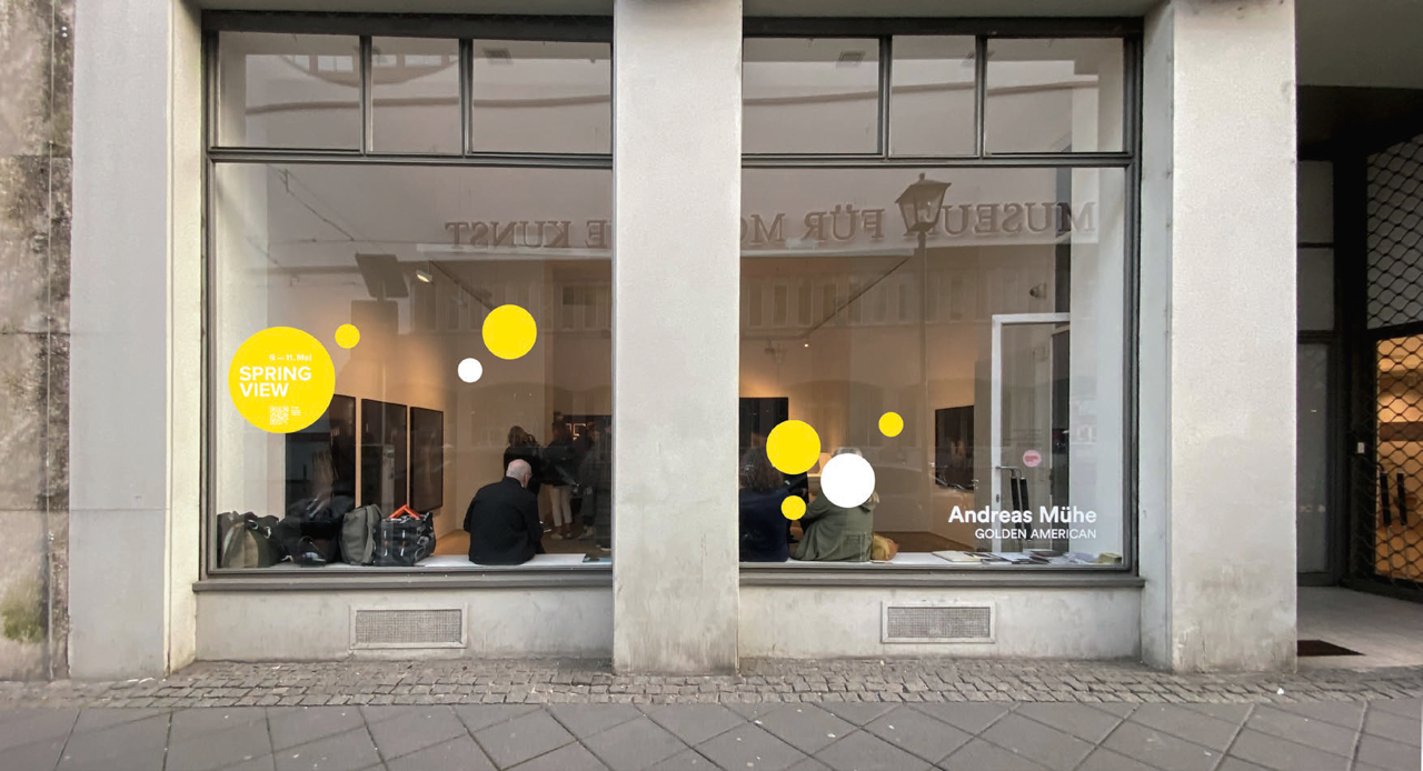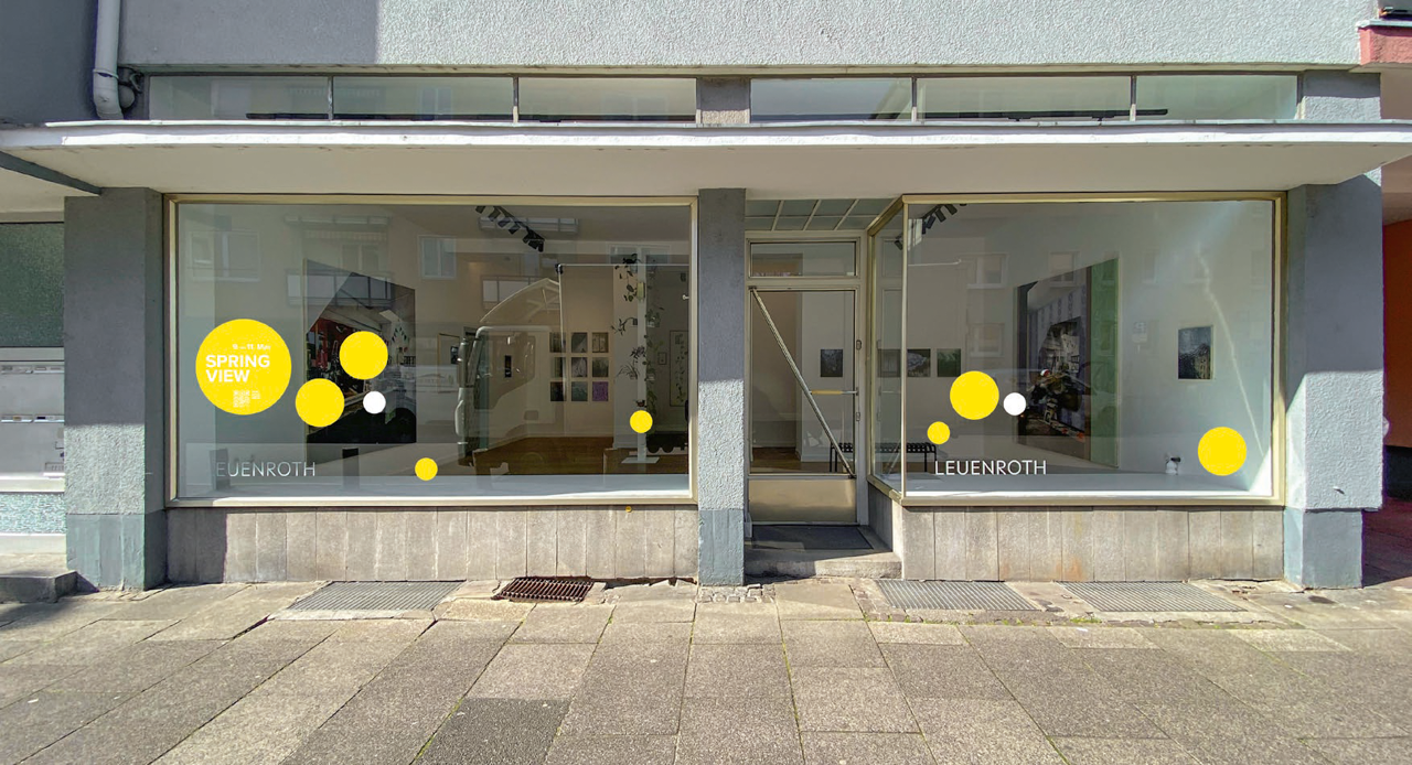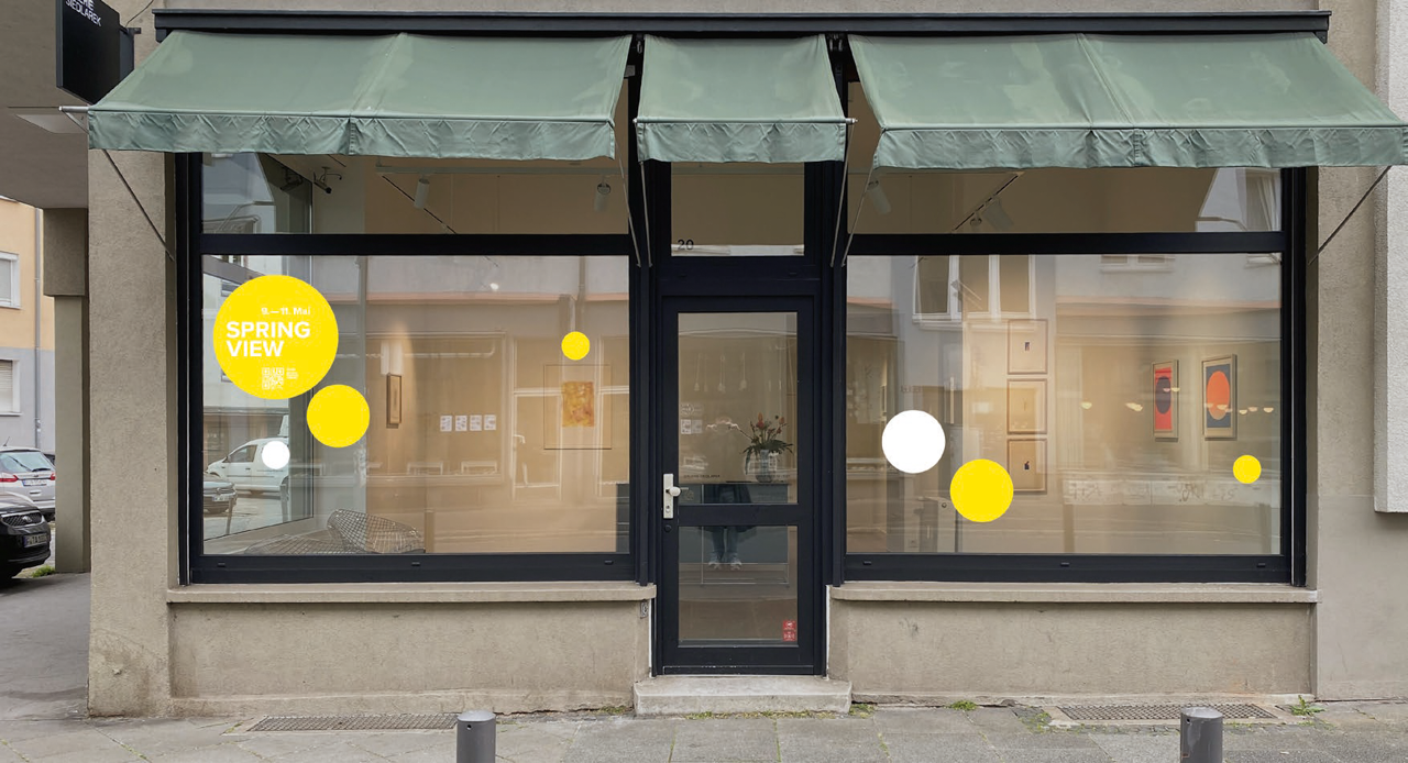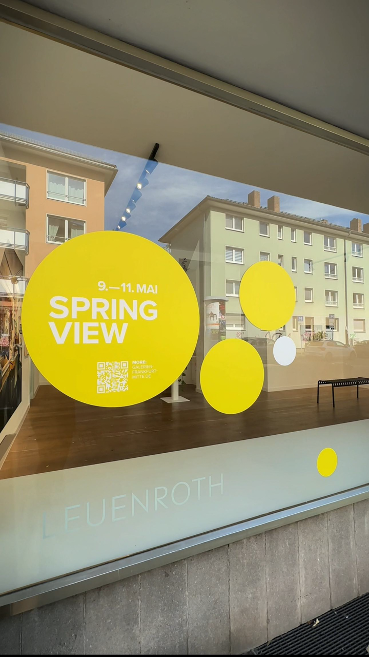 Placed in the Gallery windows along Fahrgasse, a connected sequence of yellow and white dots guides visitors through this year's Spring View. Established as a highlight during Frankfurt's art calender, Spring View connects gallery and urban space, offering a special kind of urban art experience.