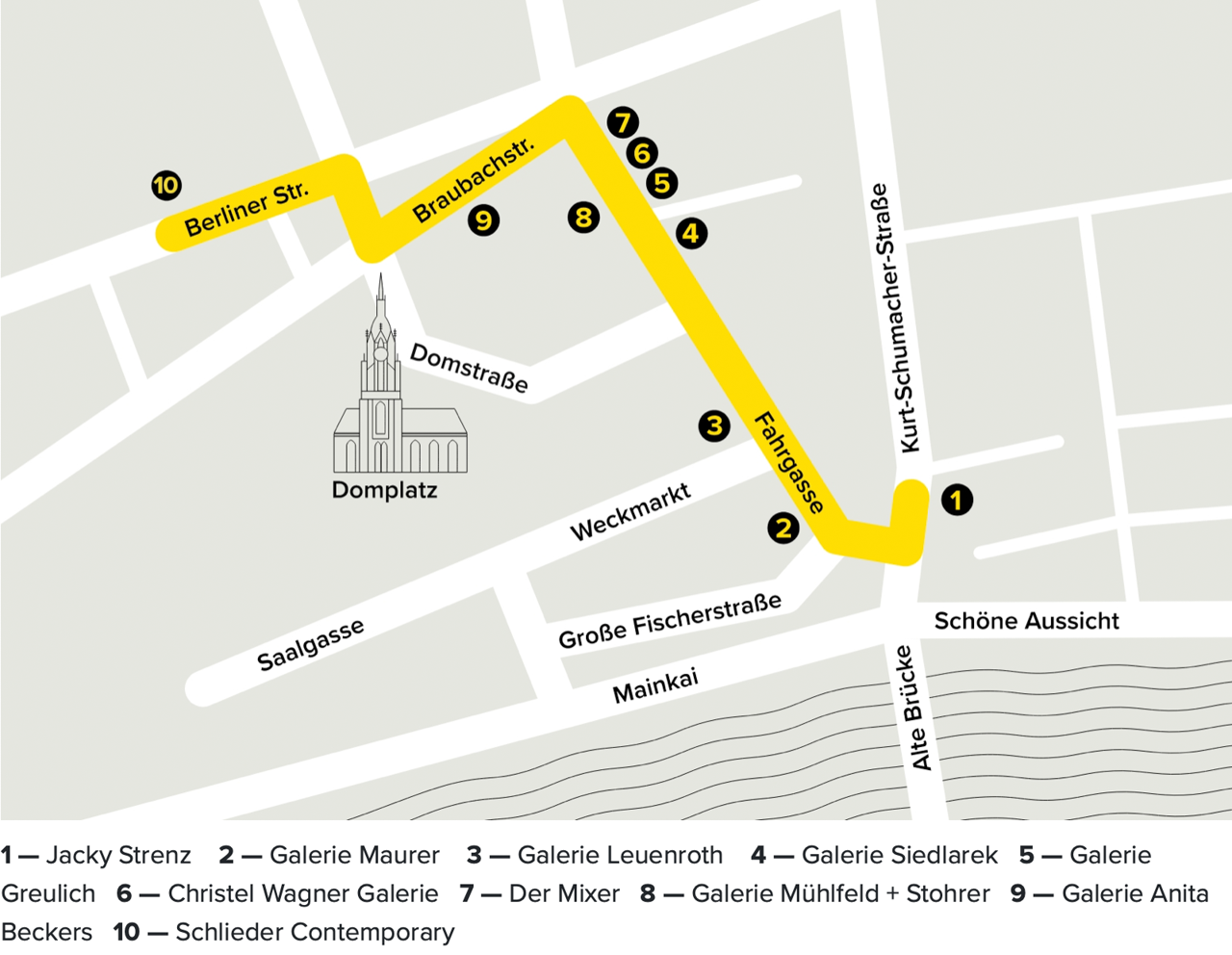 10 Galleries located near the old town, in the art district between the Museum of Modern Art, Schirn Kunsthalle, Frankfurter Kunstverein, and Portikus, have joined forces under the name Galerien Frankfurt Mitte.