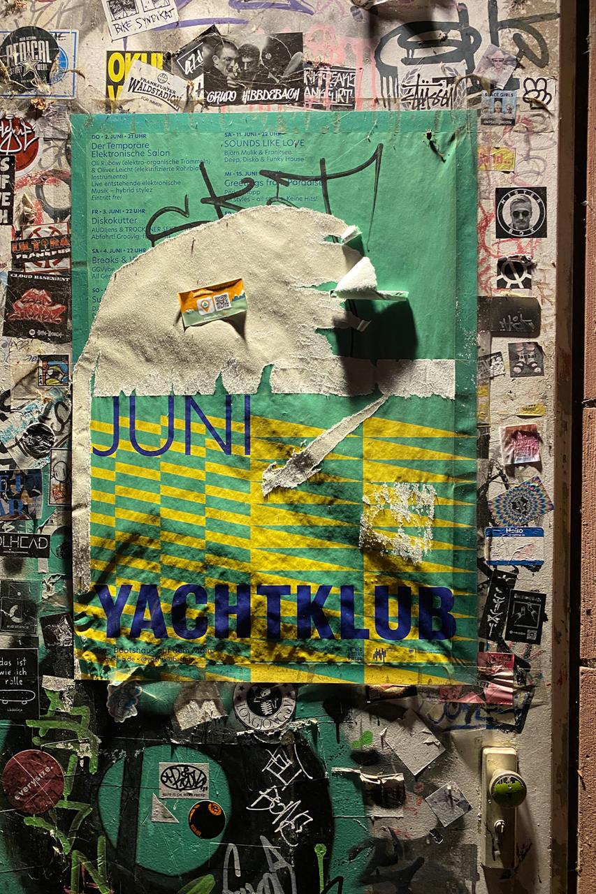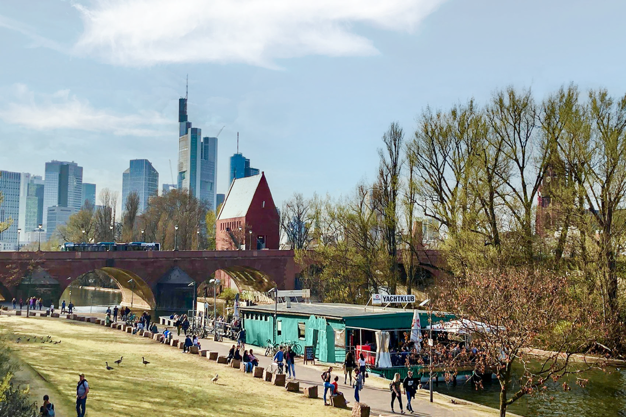 From April to October, the boathouse is docked in Sachsenhausen, offering a view of the Skyline. In addition to weekend parties, concerts, and a variety of cultural events, Yachtklub provides a sunny spot to relax, with Tapas and homemade cakes.